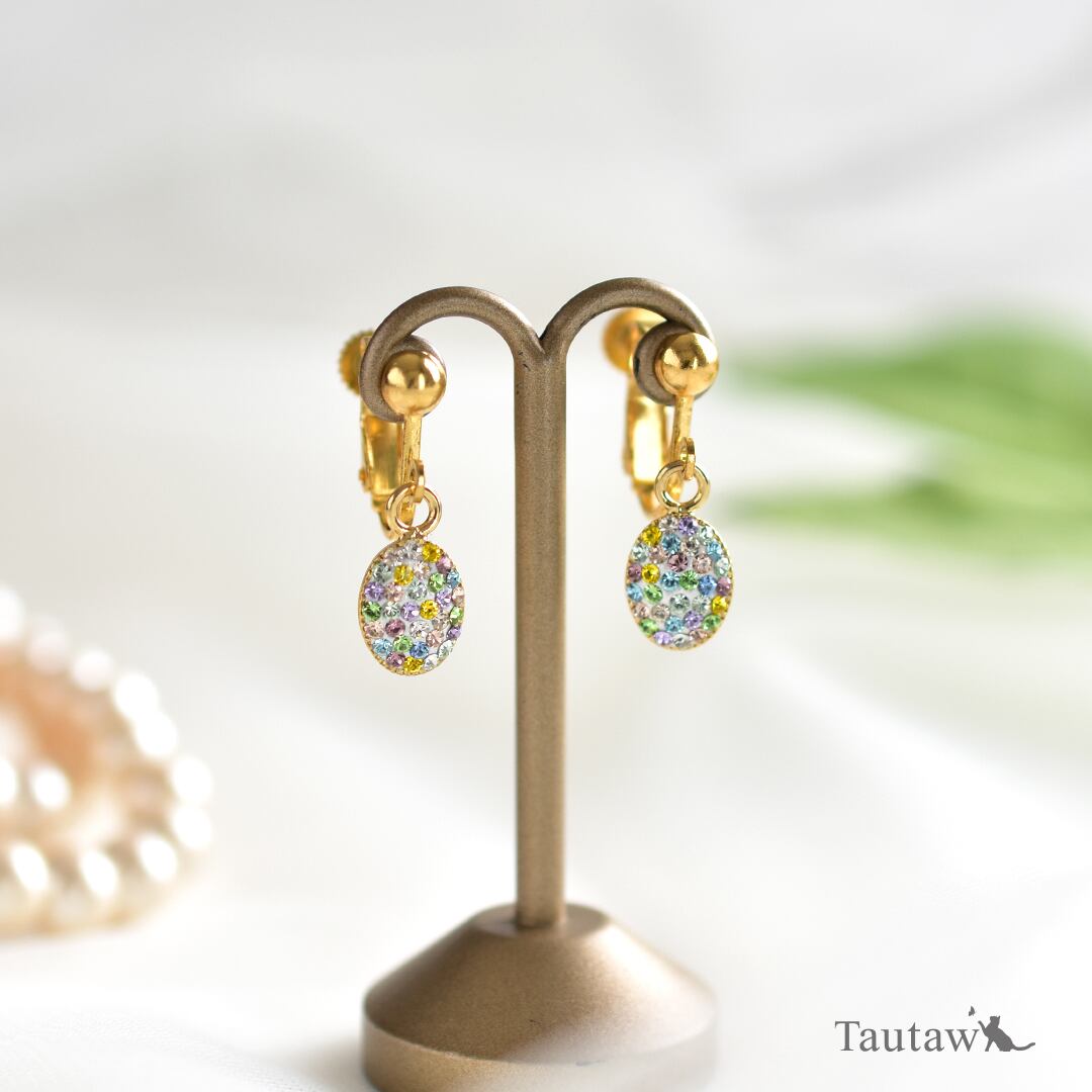 楕円形モチーフに、プレシオサ社のクリスタルを隙間なく敷き詰めたピアス・イヤリングです。