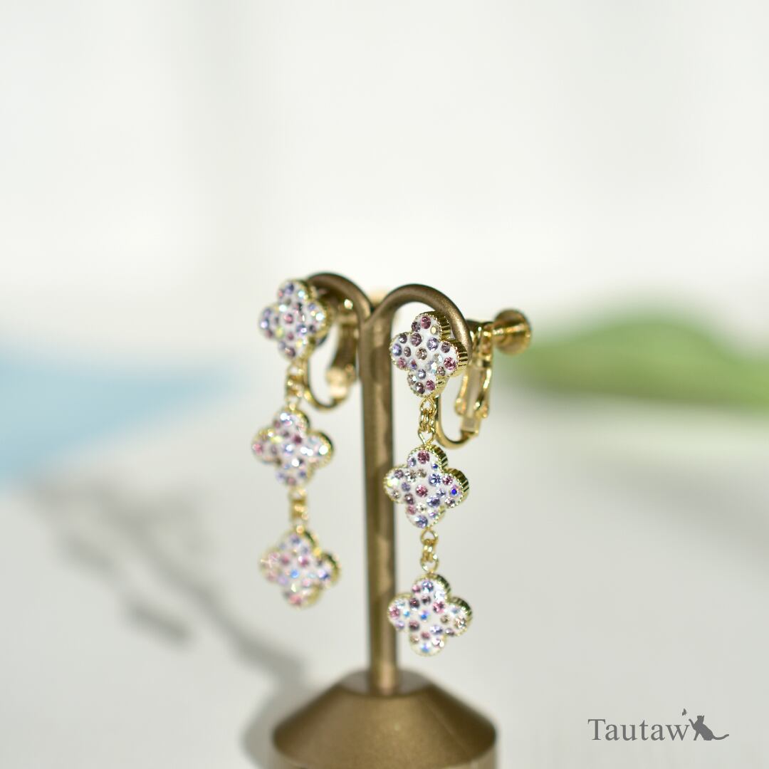 幸運のモチーフであるクローバーを、3つ縦に連ねたデザインのピアスです。