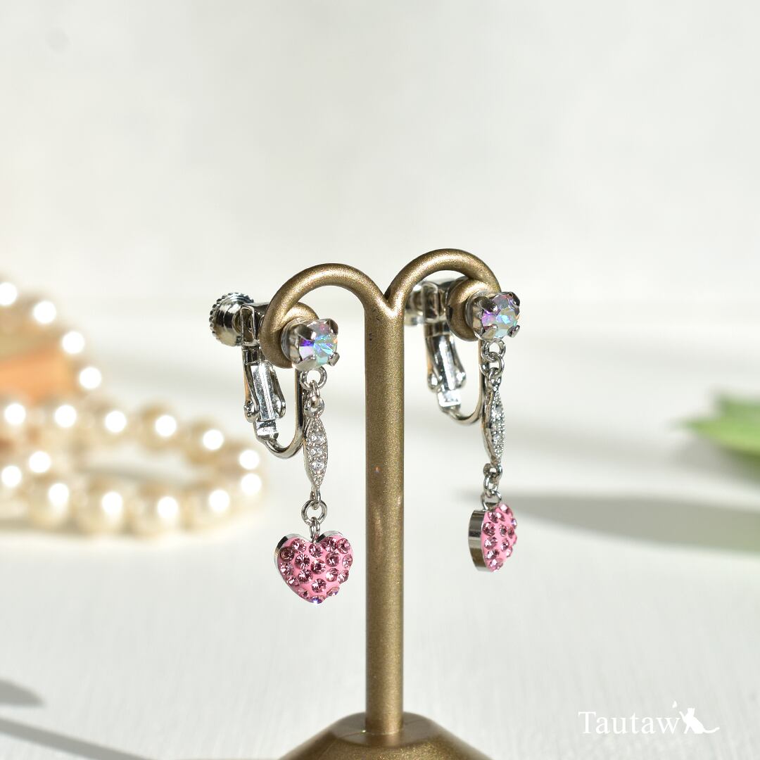 小ぶりなハートモチーフに、やわらかなピンクカラーのクリスタルガラスを一粒ずつ埋め込み、