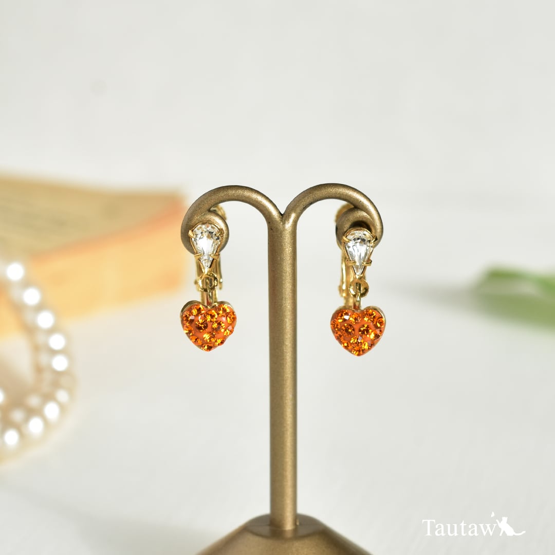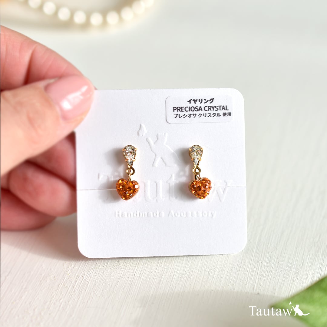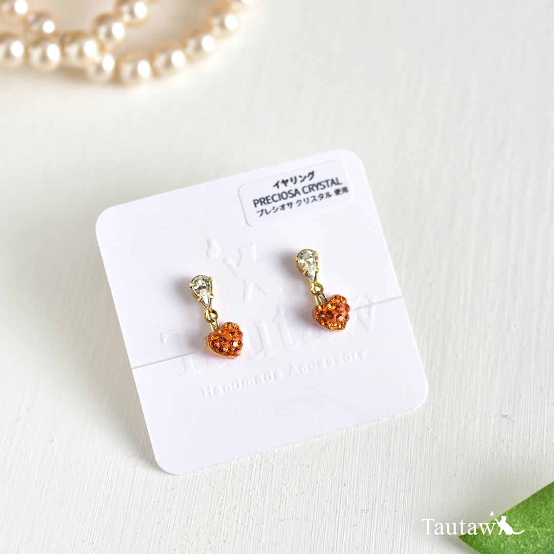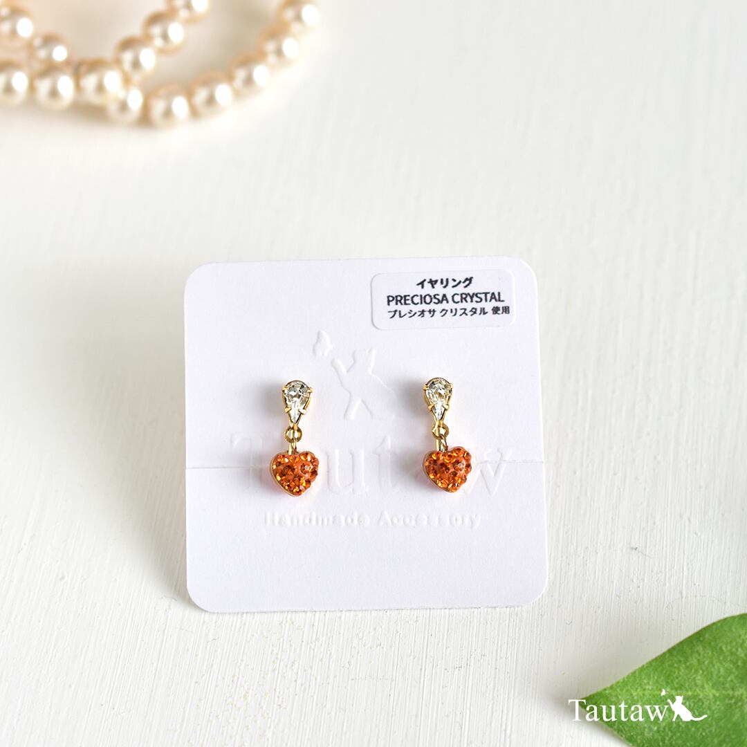 透明感のある雫型クリスタルに、小さなオレンジカラーのハートモチーフを添えた、