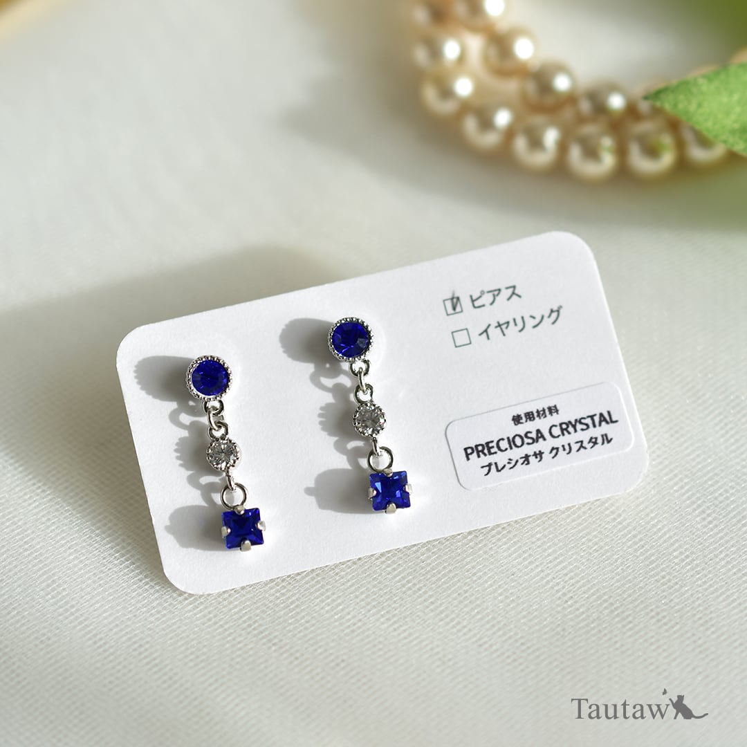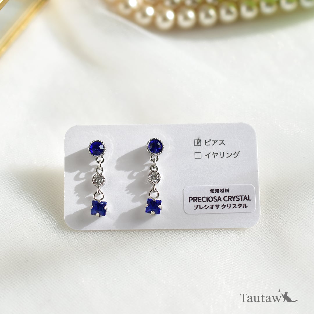 上質な輝きで知られるプレシオサ社のクリスタルガラス(サファイアカラー)を使用した、軽やかに揺れるスイングピアスです。