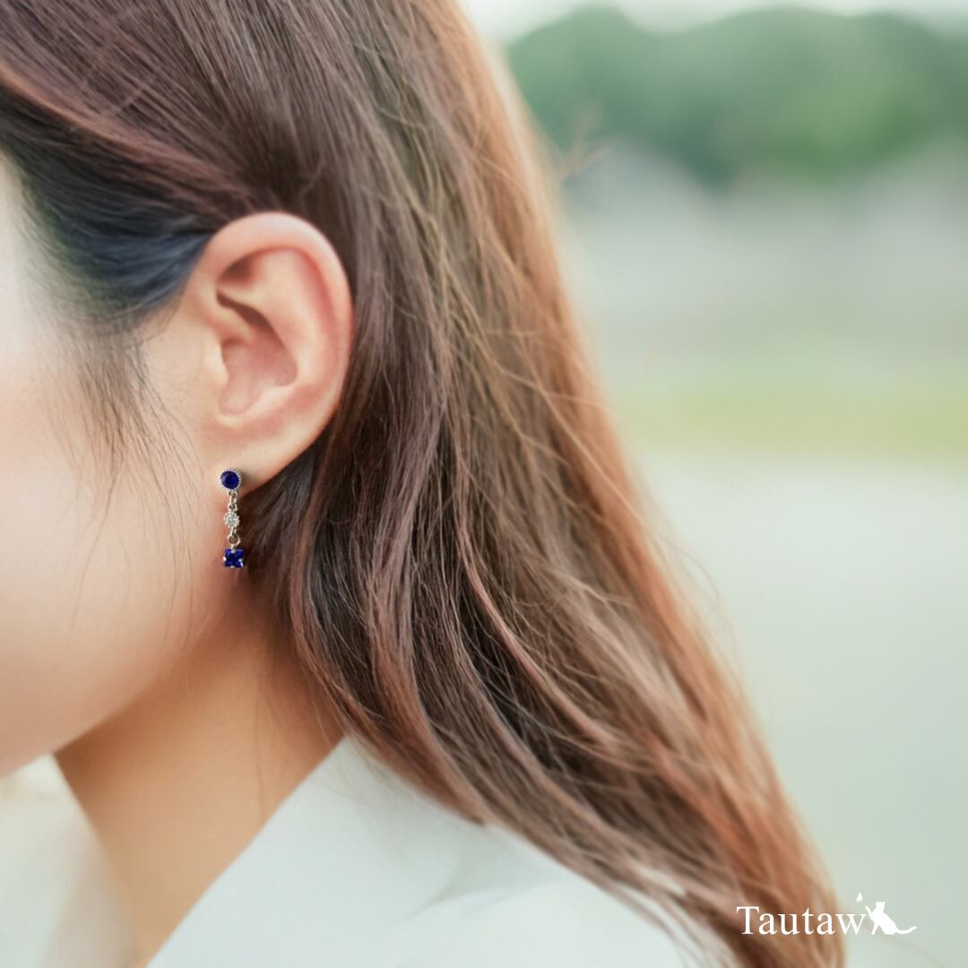 その下にクリアクリスタルと立体的なキューブカットのサファイアカラーを連ね、動くたびに光を受けて静かにきらめきます。