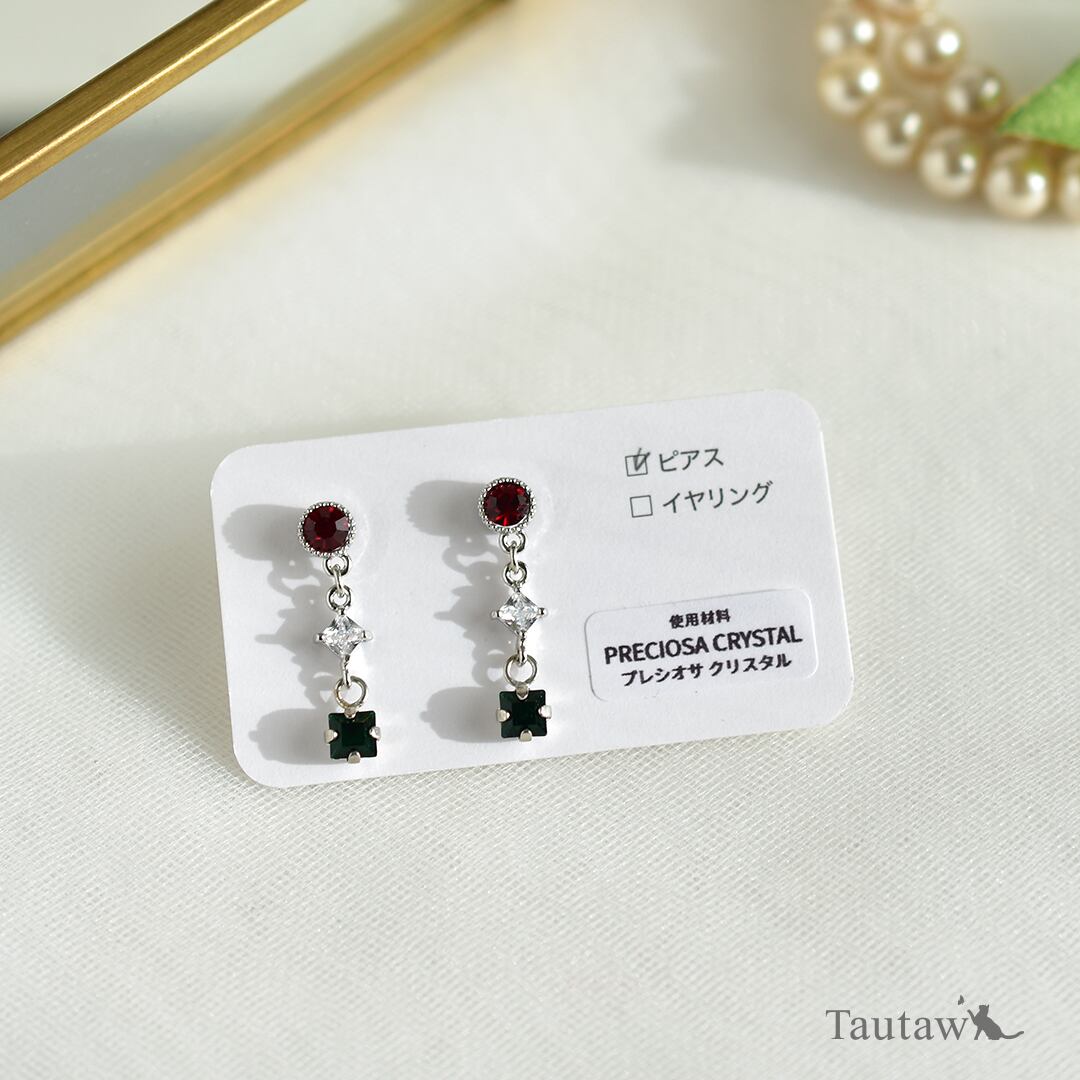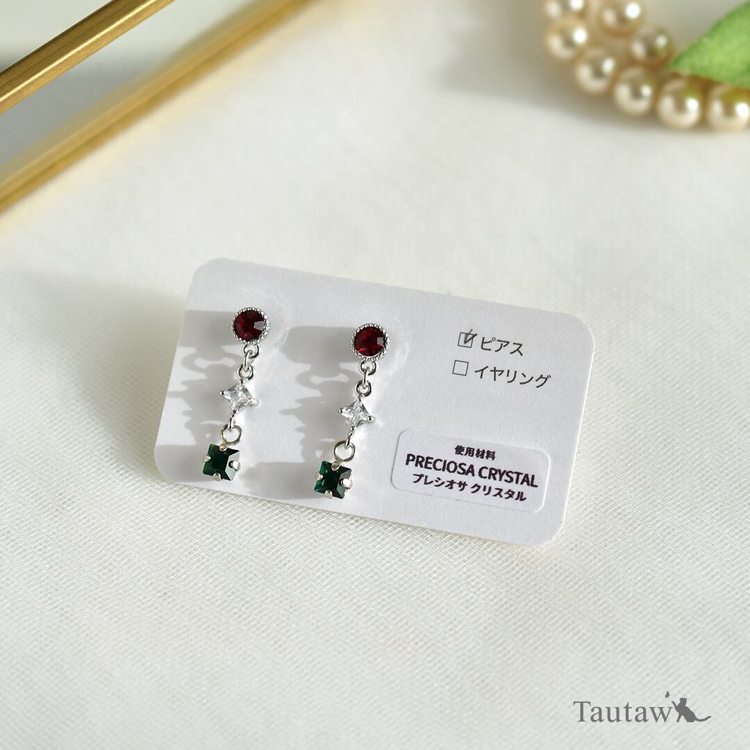赤×緑というクラシカルな配色を、プレシオサクリスタルならではの透明感で軽やかに仕立てた大人のためのカラーピアスです。