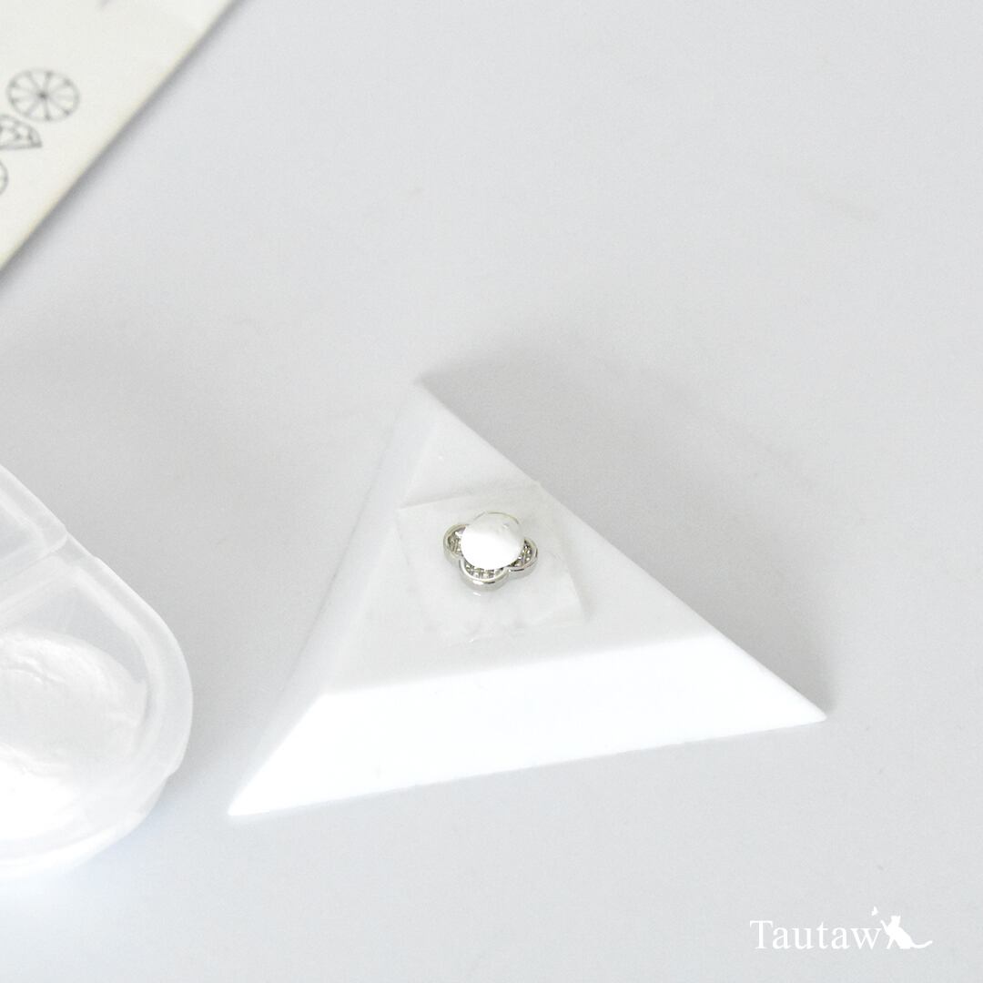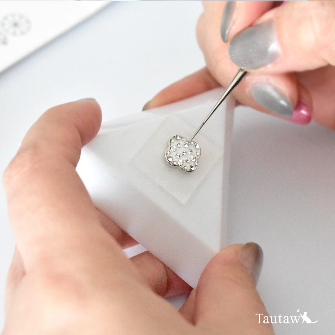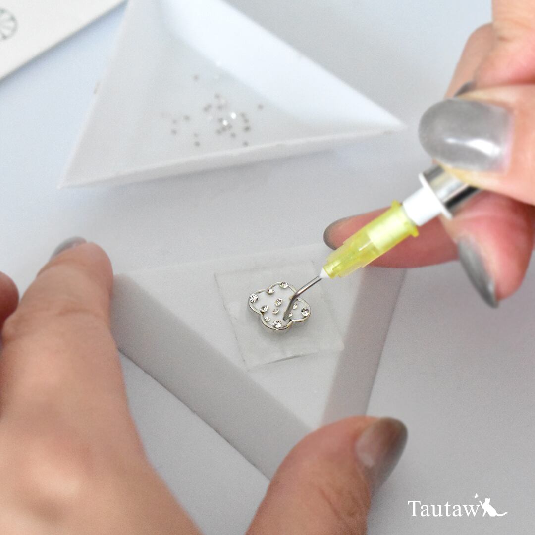 1cmほどのクローバーのモチーフに小さなプレシオサクリスタルを埋め込みました。